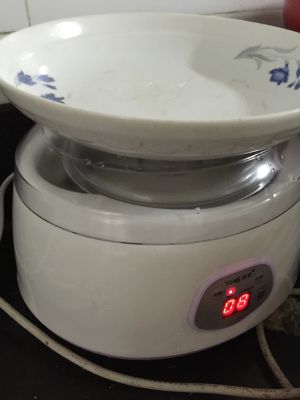 在主锅内加入适量温水,把内胆锅放入,盖上内盖、外盖!(内锅会飘动,外盖容易走位,用其它东西压住外盖!)设定酸奶功能8小时!