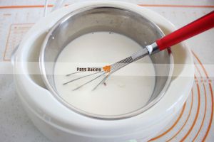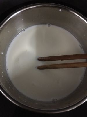 牛奶倒入小奶锅中,开小火,加热牛奶到35度左右