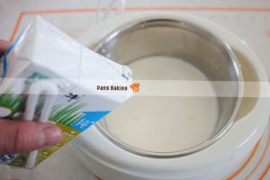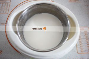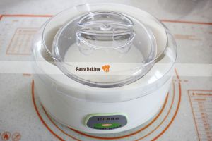 然后放进酸奶机,刚刚的热水大概放凉到40度左右,从边边倒入,合上胆盖子,8个小时后拿出来放入冰箱冰24小时口感最佳。如果用酸奶菌就发酵10个小时,用酸奶源就8个小时。