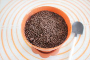 先铺一张油纸,再将奥利奥饼干碎倒入油纸上,用擀面杖碾碎,