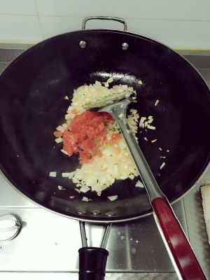 热锅凉油一滴滴,放蒜末煸出香味放洋葱,翻炒片刻加入番茄继续炒