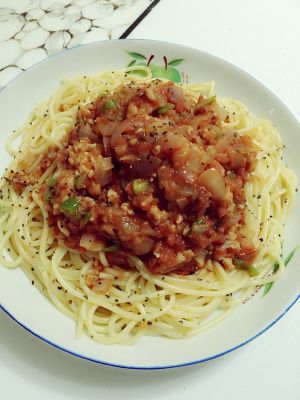 面最好冷水过下,反正我都很随意的做,肉酱平铺在面上,再撒少许黑胡椒粒,完成