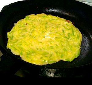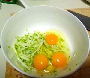 西葫芦切丝,放入少许的盐,打三个鸡蛋,搅拌!