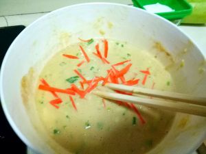 放入面粉,搅拌至上劲儿,加点胡萝卜丝,放入少许油,搅拌,静至15分钟,让面粉充分吸水膨胀!