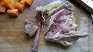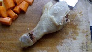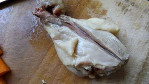 琵琶腿先冷水入锅焯一下水,取出后先用刀背把关节处敲断。