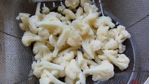 花菜掰小块放开水里焯至八分熟,沥出后用冷水冲一下。水里放少许盐,据说有助于让花菜里的小虫子跑出来。