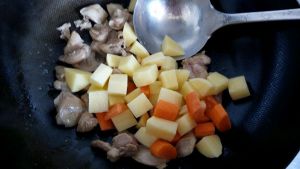 土豆,胡萝卜倒入锅内翻炒至土豆中间发白。注意胡萝卜丁切小一点,因为胡萝卜比土豆不容易熟。。。好像是灿荣说的。