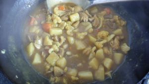 加入花菜和咖喱块,小火盖盖焖一会儿,让咖喱块融化一下。