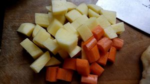 土豆和胡萝卜切小丁。如果炒着吃或做汤的话,土豆最好先放水里泡一下,去掉一些淀粉,会脆一点,但咖喱饭正好需要这个淀粉,所以就不泡了。
