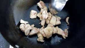 锅中加少许油,放入鸡腿丁煸炒一下。