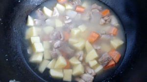 加入水,量和食材齐平即可,加盖大火煮开,中火煮至土豆九分熟。