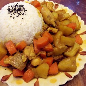 饭装入碗里压实,倒扣盘子,一点黑芝麻装饰,加入咖喱鸡。方可上桌食用。
