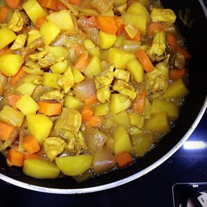 锅倒入油,放入红萝卜和土豆翻炒,再放入洋葱一起翻炒片刻,咖喱粉和水和生粉调均匀倒入,加入一点盐,大火烧开转小火焖。 另起锅,放入蒜头,翻炒鸡块,一点盐,一点酱油,翻炒至微熟,倒入土豆红萝卜,再一起焖。 盐和水根据自己口味自行加入调配。 焖至土豆变软,锅内汤汁浓稠,便可关火。