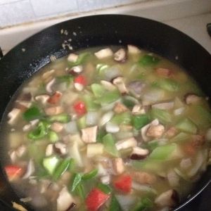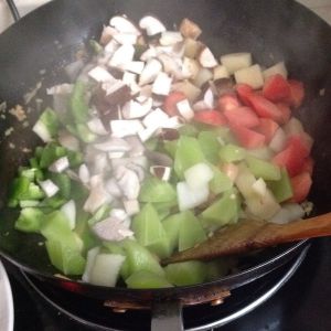 加入切好的茄子,蘑菇,甜椒,煮熟,最后加入鱼露和白砂糖即可。