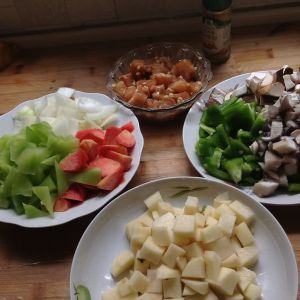 鸡肉洗净,用料酒、盐、生粉腌制十五分钟左右。土豆、胡萝卜、青椒切小块备用。