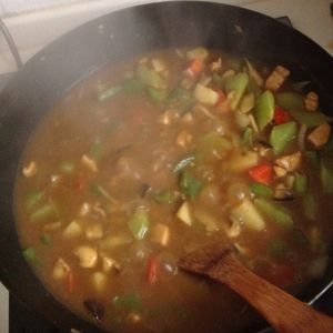 热锅放油,我放的是调和油,这个不讲究,放入香茅沙姜,炒出香味,放鸡腿肉炒至发白。 再放土豆炒,见土豆边呈半透明了,放彩椒洋葱炒软,然后就加水,刚好能漫过食材就好 水滚后开中小火,放入咖喱块,煮至浓稠状即可。 中途需要炒炒翻翻,以免粘锅煮糊了。 本来是要放6块咖喱块的,我不喜欢太粘稠和重咖喱味,只放了4块,味道正合我意。 喜欢重口的可以全放咖喱块,再加点盐。
