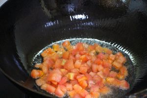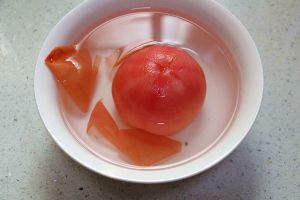 轻松剥去外皮,皮丢弃,去了皮的西红柿切一厘米见方的小丁,尽量小不要大