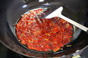 多倒些油,油锅烧热,然后关火,待油温冷却至不那么烫时把辣椒和花椒倒进去,不可过早也不可过晚,早了辣椒黑掉了,晚了红油出不来