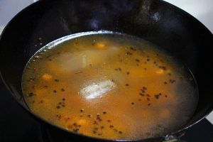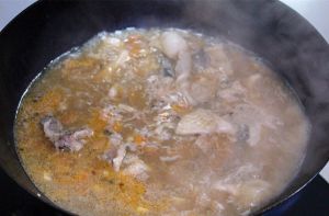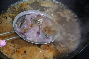 加入温水或开水,让鱼汤熬成奶白色,后将鱼骨捞入配菜中。