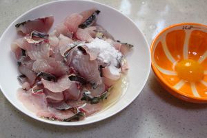 鱼片加盐、蛋清、料酒、淀粉码味半小时