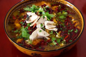 煮开后用锅铲推一下,防止上面的鱼肉不熟。鱼肉熟了以后关火,倒入刚才盛菜的盆中。撒上炸过的灯笼椒和花椒,刷锅,倒入香油和食用油烧热,淋在灯笼椒和花椒上。上菜了!