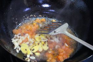 下姜片,蒜末,和少量的花椒翻炒出香味