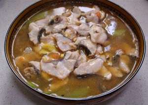 起大火,将鱼片一片片下入,等鱼肉变白立即着火捞出。