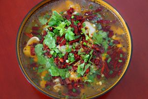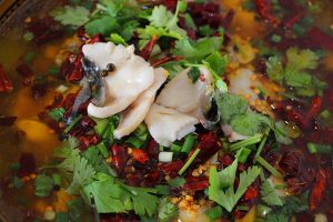 下面开始做,热锅加少许油下入清洗干净切成段的油麦菜、豆芽、豆腐等(可根据自己喜好添加配菜),加少许盐炒至断生,盛出一大碗内; 锅清洗干净,加少许油,依次下入火锅底料、郫县豆瓣酱、姜片、蒜丁、少许花椒、辣椒段,炒至出红油加水,煮开调味,下入腌制好的鱼片和鱼骨(切勿搅动),烧开,10秒钟过后盛出于大碗,锅洗干净,加入食用油适量;大碗内撒上花椒麻椒、辣椒段,葱花、香菜(这两样视情况添加)浇上热油,这就完成啦,忘记拍照片了,见谅