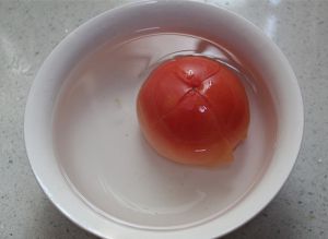 西红柿在上面轻轻划十字刀,用开水烫几秒钟