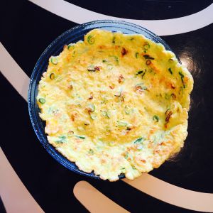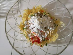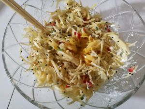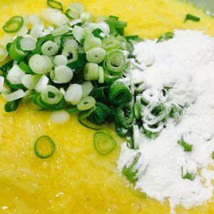 加入三汤勺面粉,葱花,盐,搅拌均匀