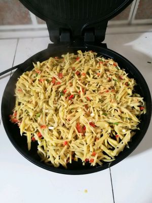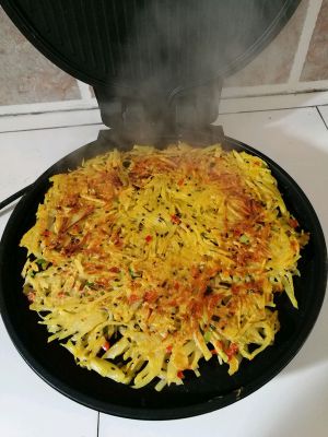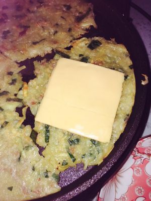 土豆擦丝后放入盐葱花五香粉瘦肉(提前用蚝油味好)可以放虾皮提鲜!放入电饼档快要熟时放入芝士片!待芝士变软出锅装饰即可