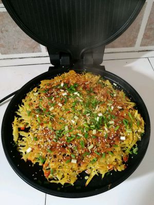 最后打开盖,土豆饼表面,撒上白芝麻,葱花,继续煎烤一分钟即可!用铲子慢慢的拿出来,切开摆放在盘子里!