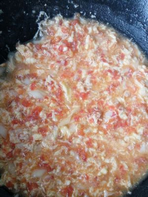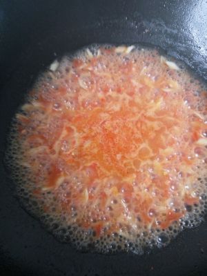 锅热油,入蒜末炒香,再入切碎了的西红柿翻炒,加入糖和盐继续翻炒,炒到西红柿基本没有大块的