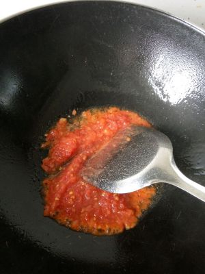 放入西红柿块,并放入一勺番茄酱,出红油改小火熬制西红柿变细沙加入水熬开,放入生抽、盐和鸡精