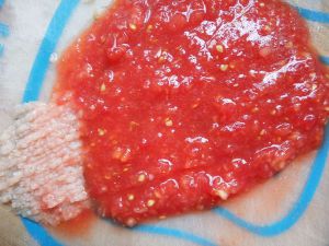 西红柿去皮切成西红柿泥,这样比较容易出西红柿油!里脊肉剁成泥!