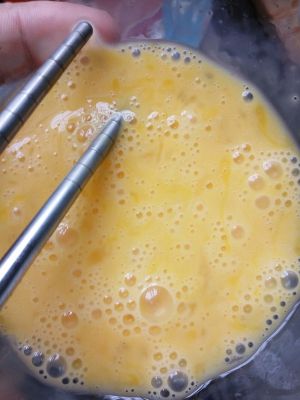 倒入鸡蛋液,煮五秒钟再翻动,这样的鸡蛋液是成片的!