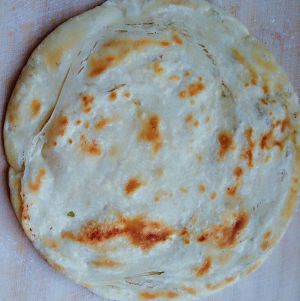 将卷完的面卷擀至圆饼状,薄些,尽量保证葱花不扎破面皮