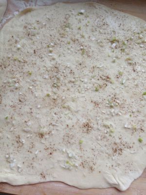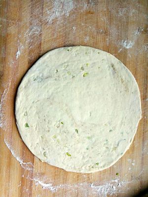 将面团擀成面饼,不要太厚,在上面均匀涂些油,撒上盐,胡椒粉和葱花