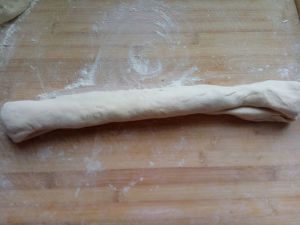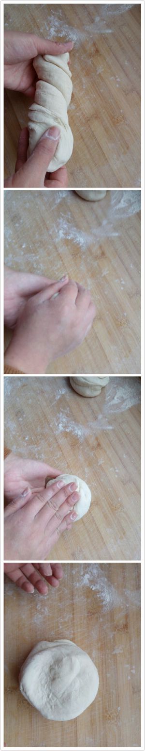 从面饼的一边卷起,成长卷状,再从长条卷的一头开始卷起,注意干面粉不能太多,否则面卷不易贴合