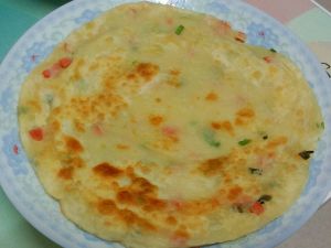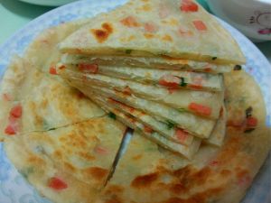 擀面杖擀成薄饼,刷有油,撒上葱花