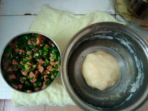 面粉加汤勺油,用开水把面粉搅拌成棉絮状,再揉成团,盖上盖子,闷至10-20分钟。火腿、葱切末,加入适量的油跟盐,备用!面团杠成0.5厘米厚度,把腌制的火腿葱均匀摊在面皮上,慢慢卷起,圈成一圈,再擀平成1厘米厚度