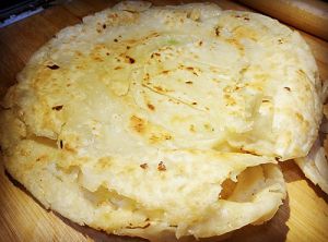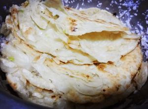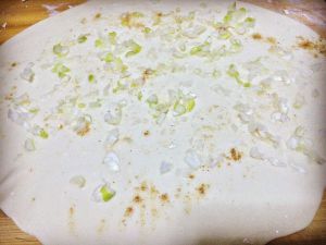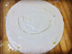 将面团赶成薄薄的饼,倒适量油,使整张饼均匀沾上,然后撒上葱花,盐和十三香