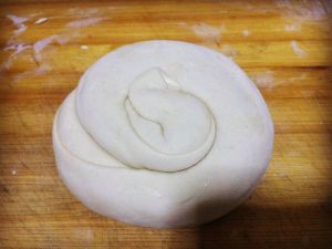 面取出来,平均分成五分。面板撒手粉,取一份,擀成长方形薄片,撒上培根香葱酥油馅卷起,捏紧两端的口,从一端卷起,成圆形。