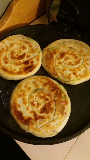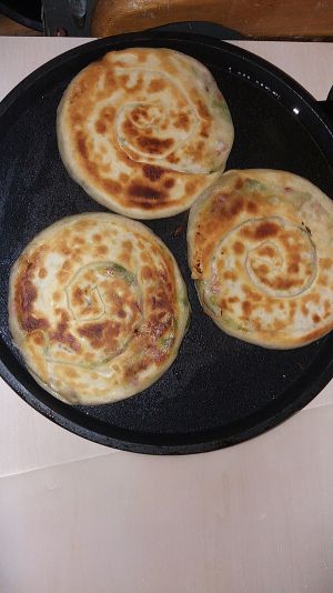 5、平底锅烧热放油,把玫瑰花葱油饼下锅煎至底部金黄,煎至金黄后加入小量水焖一下,我是用了半碗水分两次下,煎至水分蒸发和熟透即可