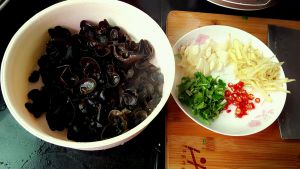 如上图,准备好泡好的木耳放入锅中煮两分钟,准备好葱姜蒜,小米辣
