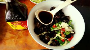 把切碎的蒜头,还有花生放入黑木耳里边,加入酱油,蚝油,芝麻油,姜丝,胡椒,辣椒丝,喜欢吃醋的话就加入白醋或陈醋都可以。