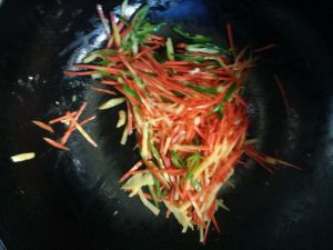 锅烧热,加入油,放入胡萝卜丝先炒一会