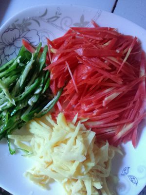 土豆、胡萝卜分别去皮后切丝,青椒洗干净后也切丝;
