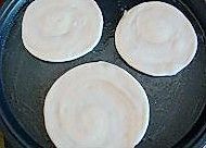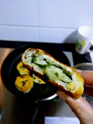 用手按扁,擀成圆形的饼。放电饼铛中,涂少许油,烙熟成金黄色即可。
