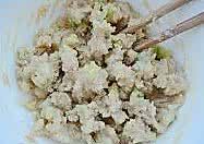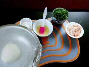 200克平常做包子馒头的高筋普通面粉加入100克热水,揉成团,盖保鲜膜20分钟。这个时候把肥肉切小丁备用,葱切碎末